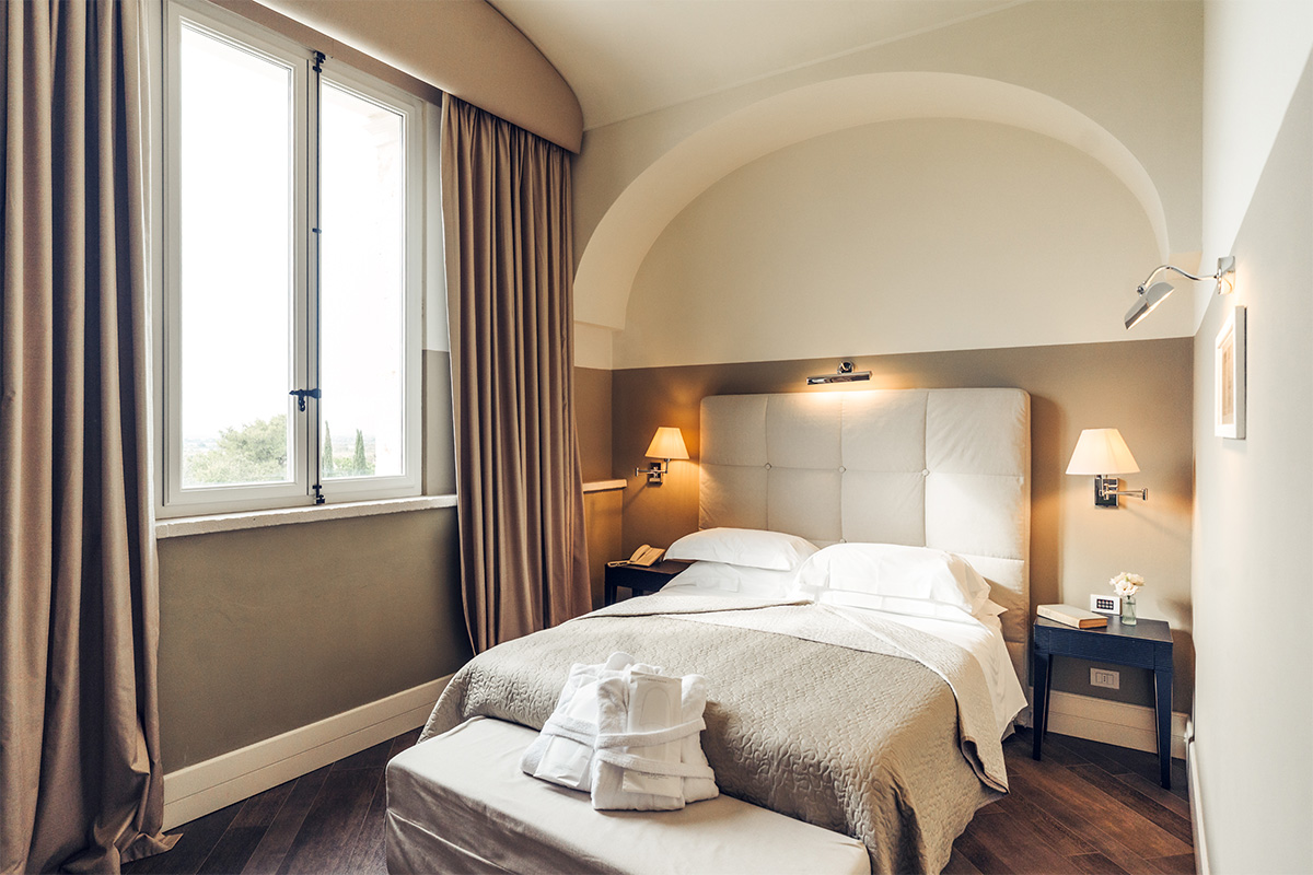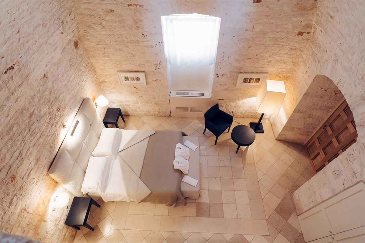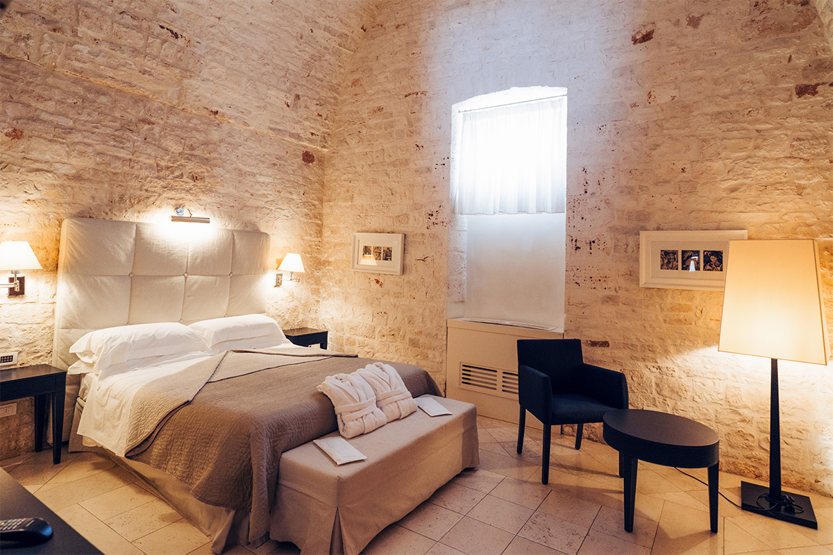 Queste camere, arredate con sobria eleganza, offrono ambienti accoglienti, arredi che richiamano i toni caldi del legno e della pietra, e balconi privati che si aprono su un'incantevole vista sulla campagna pugliese. Per chi cerca l'essenzialità di un soggiorno genuino, in un'atmosfera sempre serena e luminosa.