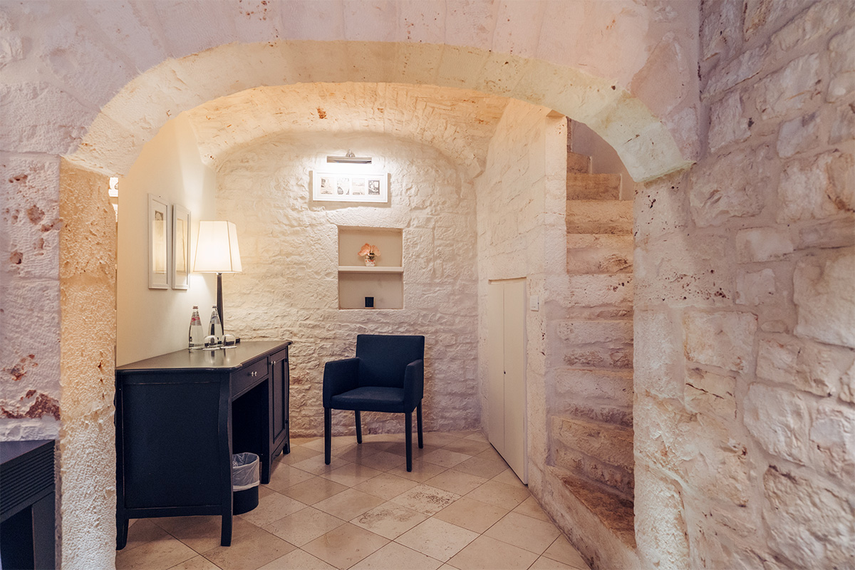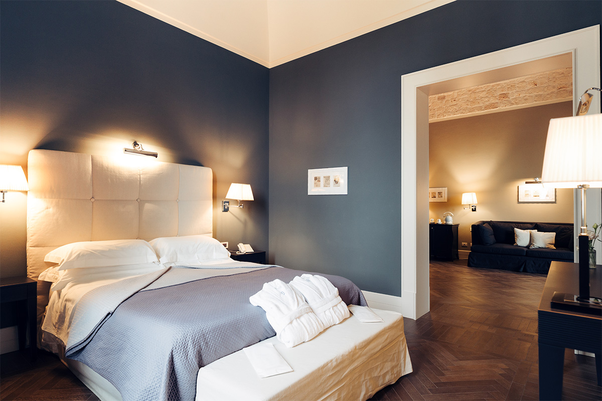 Le suite più ampie e signorili, ognuna con dettagli unici. La Suite del Massaro si articola su due livelli e custodisce un'esclusiva area benessere e un terrazzo panoramico privato. La Suite Padronale ti conquisterà con il suo charme ottocentesco e due spaziosi ambienti in cui comfort ed eleganza si intrecciano.