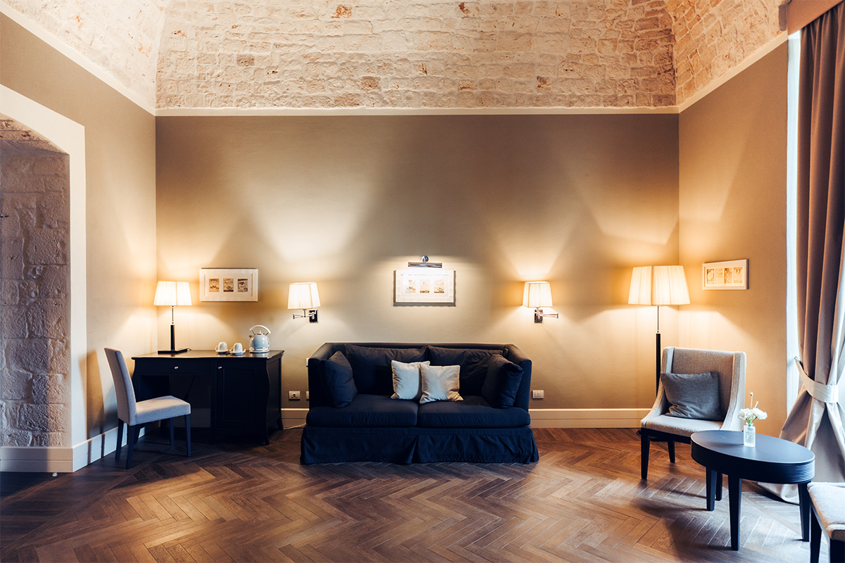 Le suite più ampie e signorili, ognuna con dettagli unici. La Suite del Massaro si articola su due livelli e custodisce un'esclusiva area benessere e un terrazzo panoramico privato. La Suite Padronale ti conquisterà con il suo charme ottocentesco e due spaziosi ambienti in cui comfort ed eleganza si intrecciano.